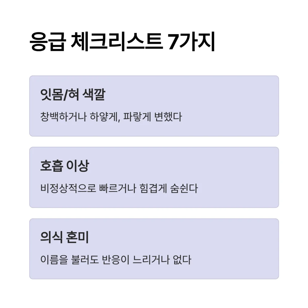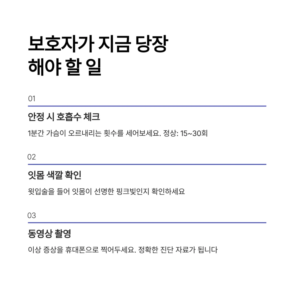 3. 동영상 촬영하기: 아이가 비틀거리는 모습, 숨 쉬는 모습, 경련하는 모습 등 ‘이상 증상’을 휴대폰으로 찍어두세요. 병원에서 백 마디 말보다 정확한 진단 자료가 됩니다.