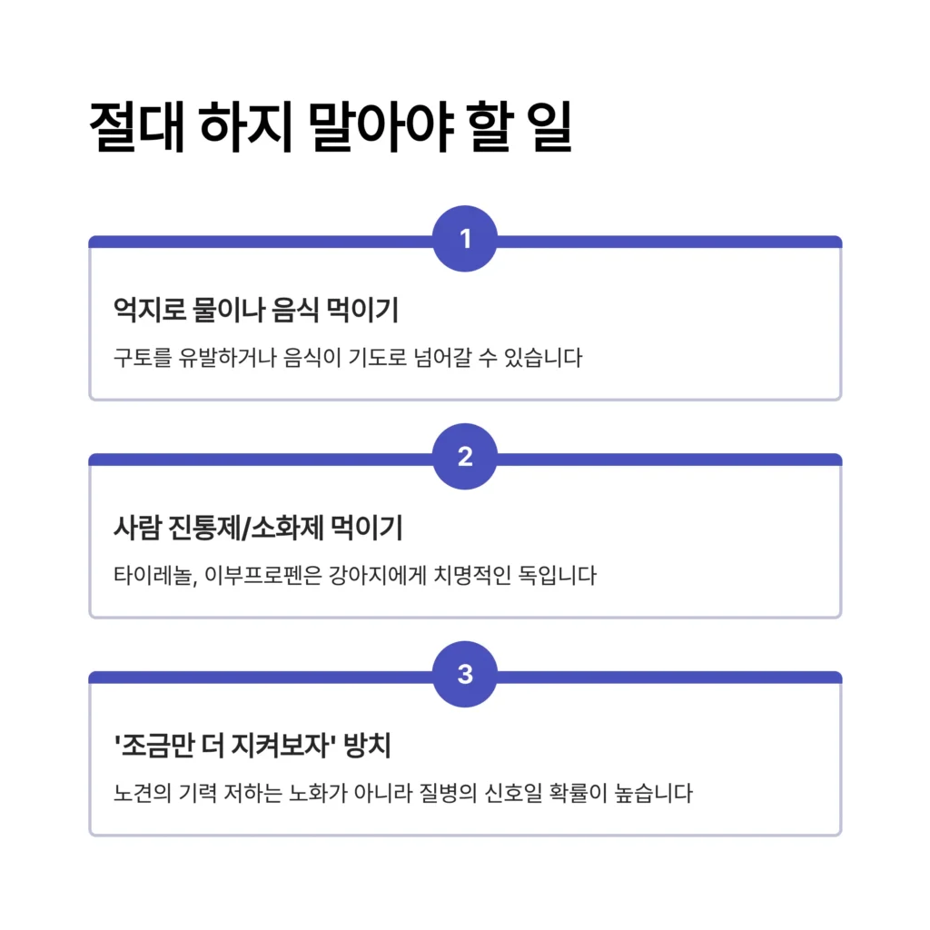 3. ‘조금만 더 지켜보자’고 방치하기: (특히 노견 보호자) 노견의 기력 저하는 ‘노화’가 아니라 ‘질병’의 신호일 확률이 매우 높습니다. ‘괜찮아지겠지’라는 안일한 생각이 골든타임을 놓치게 만듭니다.