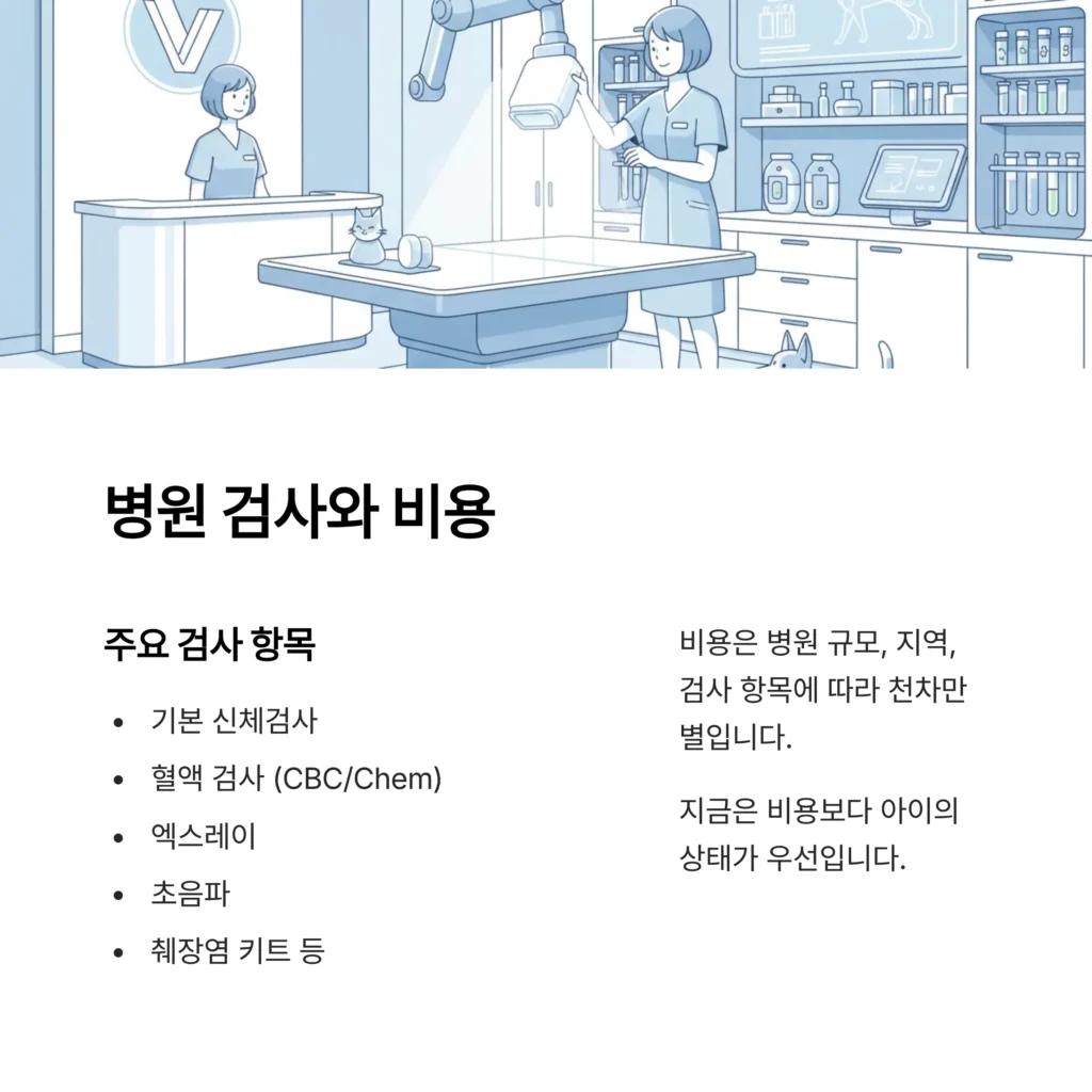 보통 기본 신체검사, 혈액 검사(CBC/Chem), 엑스레이, 초음파 등을 진행하게 됩니다. (본론 1의 응급 증상이 있다면 즉시 응급 처치가 우선됩니다.)