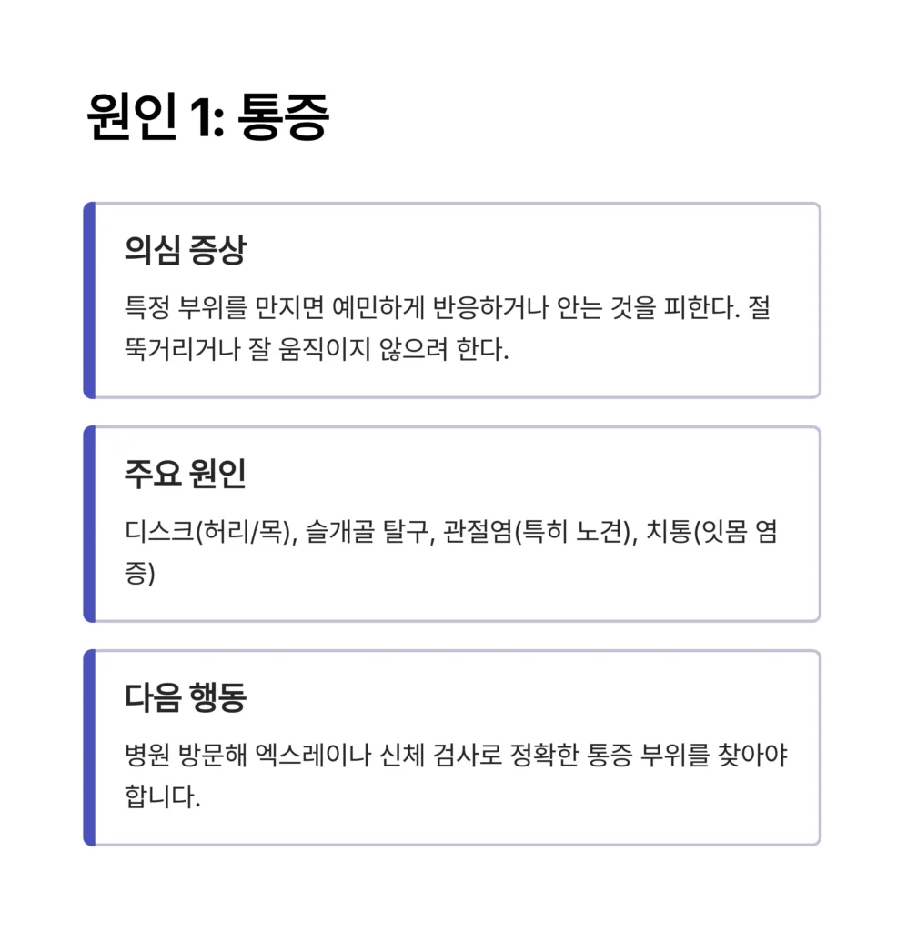 • 주요 원인: 디스크(허리/목), 슬개골 탈구, 관절염(특히 노견), 치통(잇몸 염증) 등.