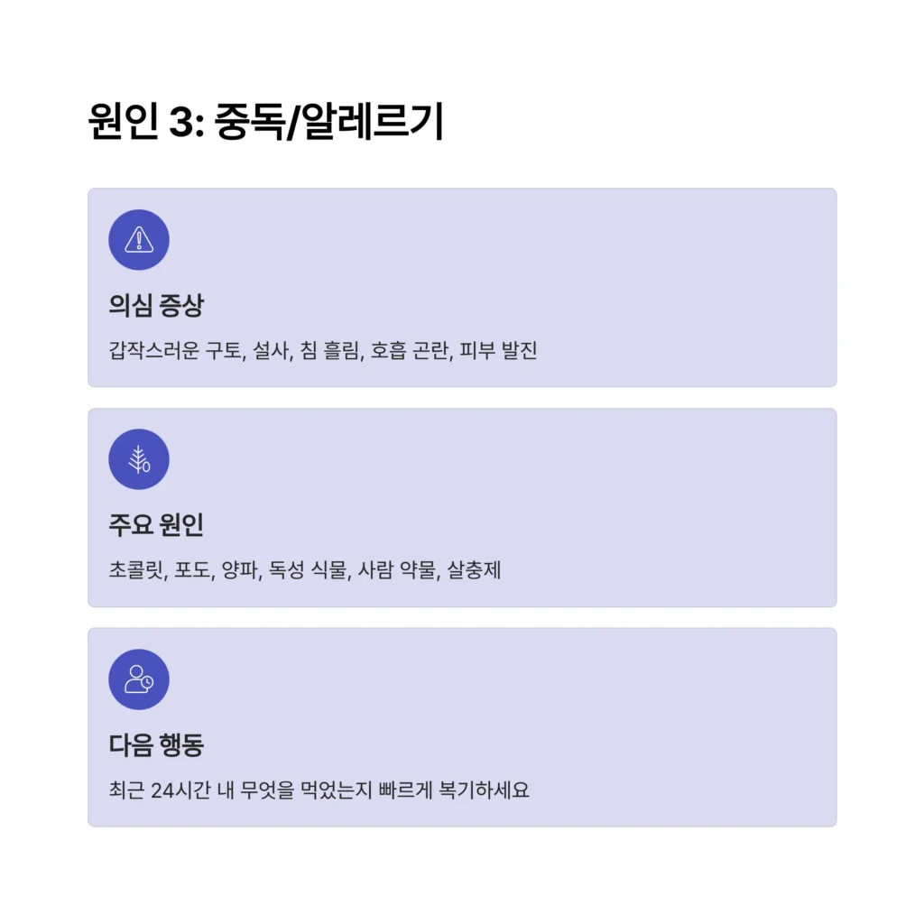 • 주요 원인: 사람 음식(초콜릿, 포도, 양파), 독성 식물, 사람 약물, 살충제 등.