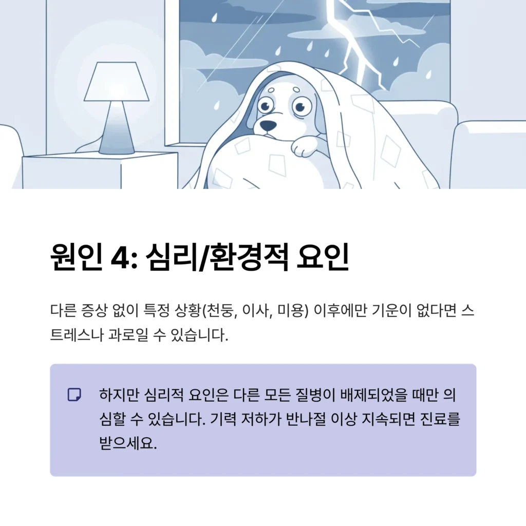 • 의심 증상: 다른 증상은 없으나, 유독 특정 상황(천둥, 이사, 미용) 이후에만 기운이 없다.