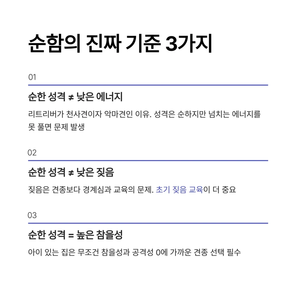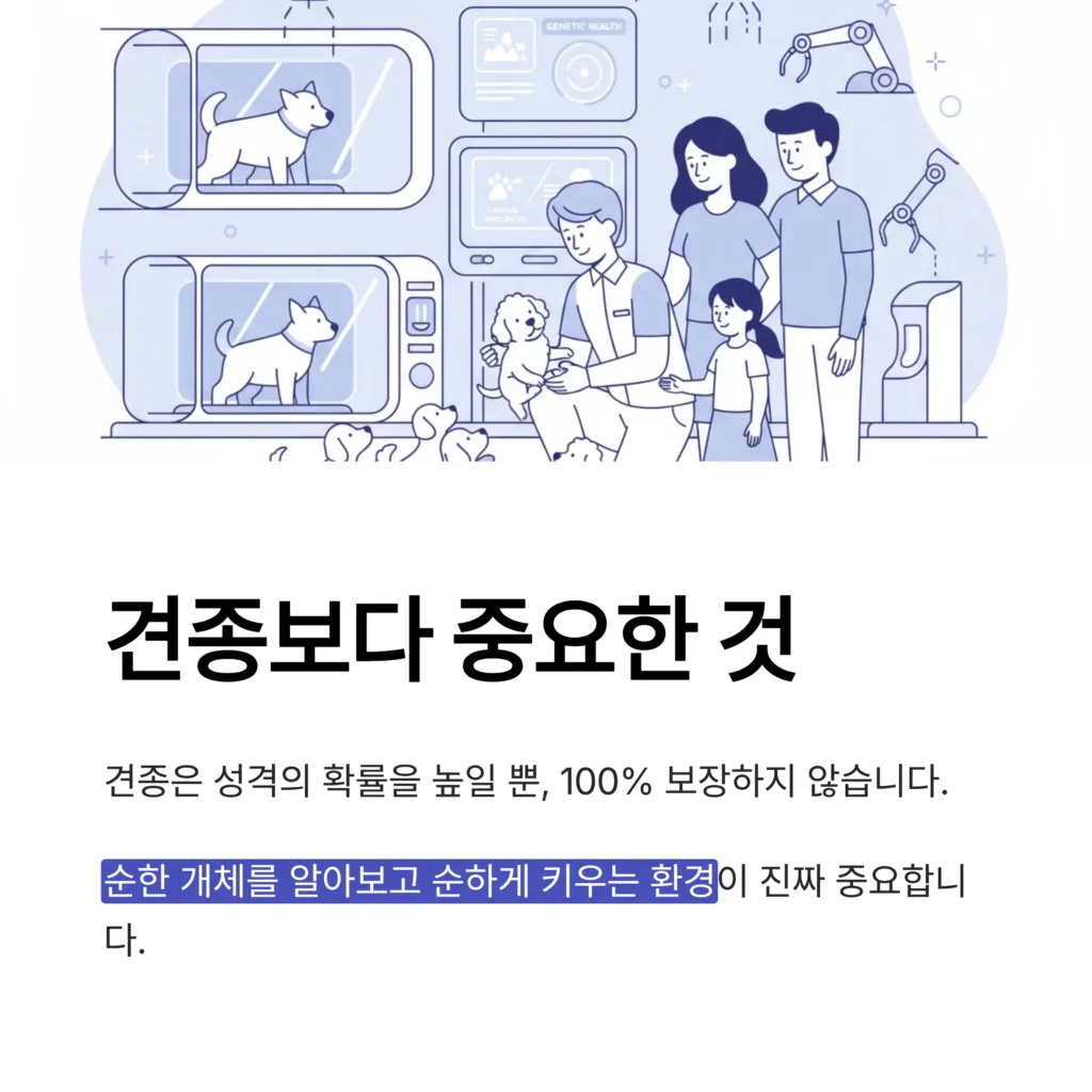 견종은 성격의 ‘확률’을 높여줄 뿐, 100% 보장하지 않습니다. 결국 ‘순한 개체’를 알아보고 ‘순하게’ 키우는 환경이 중요합니다.