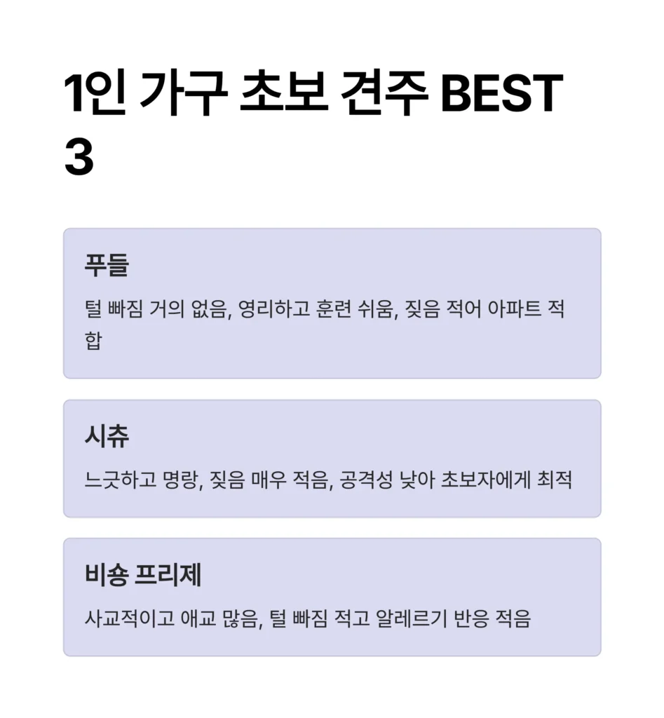 견종 리스트(푸들, 리트리버, 시츄 등)는 당신의 15년 반려 생활을 위한 ‘가이드라인’일 뿐, 정답이 아닙니다. 1인 가구에게 필요한 ‘조용함’과 아이 있는 집에 필요한 ‘참을성’은 분명 다릅니다.