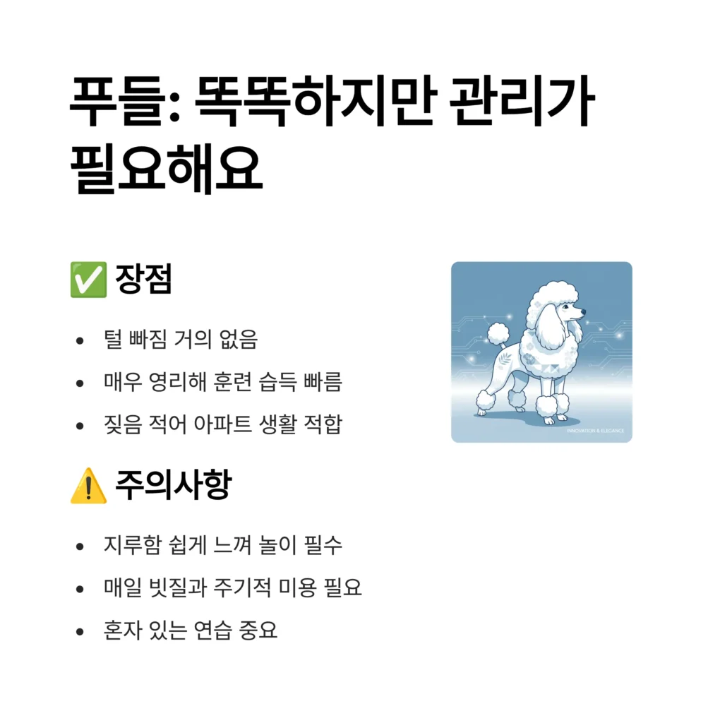 - 장점: 털 빠짐이 거의 없고 매우 영리하여 훈련 습득이 빠릅니다. 짖음이 적은 편이라 아파트나 빌라 환경에 적합합니다.