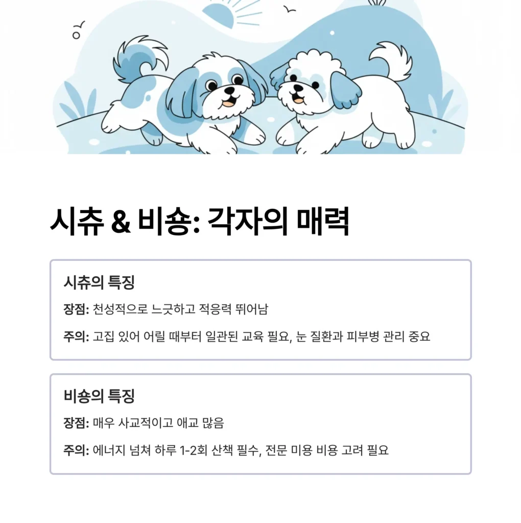 - 주의: 에너지가 넘쳐 ‘비숑 타임’이라 불리는 우다다 시간이 필수입니다. 하루 1~2회의 충분한 산책으로 에너지를 풀어주지 못하면 분리불안이나 짖음으로 이어질 수 있습니다. 또한, 솜사탕 같은 털을 유지하기 위한 ‘전문적인 미용 관리 비용’을 현실적으로 감당할 수 있는지 꼭 확인해야 합니다.