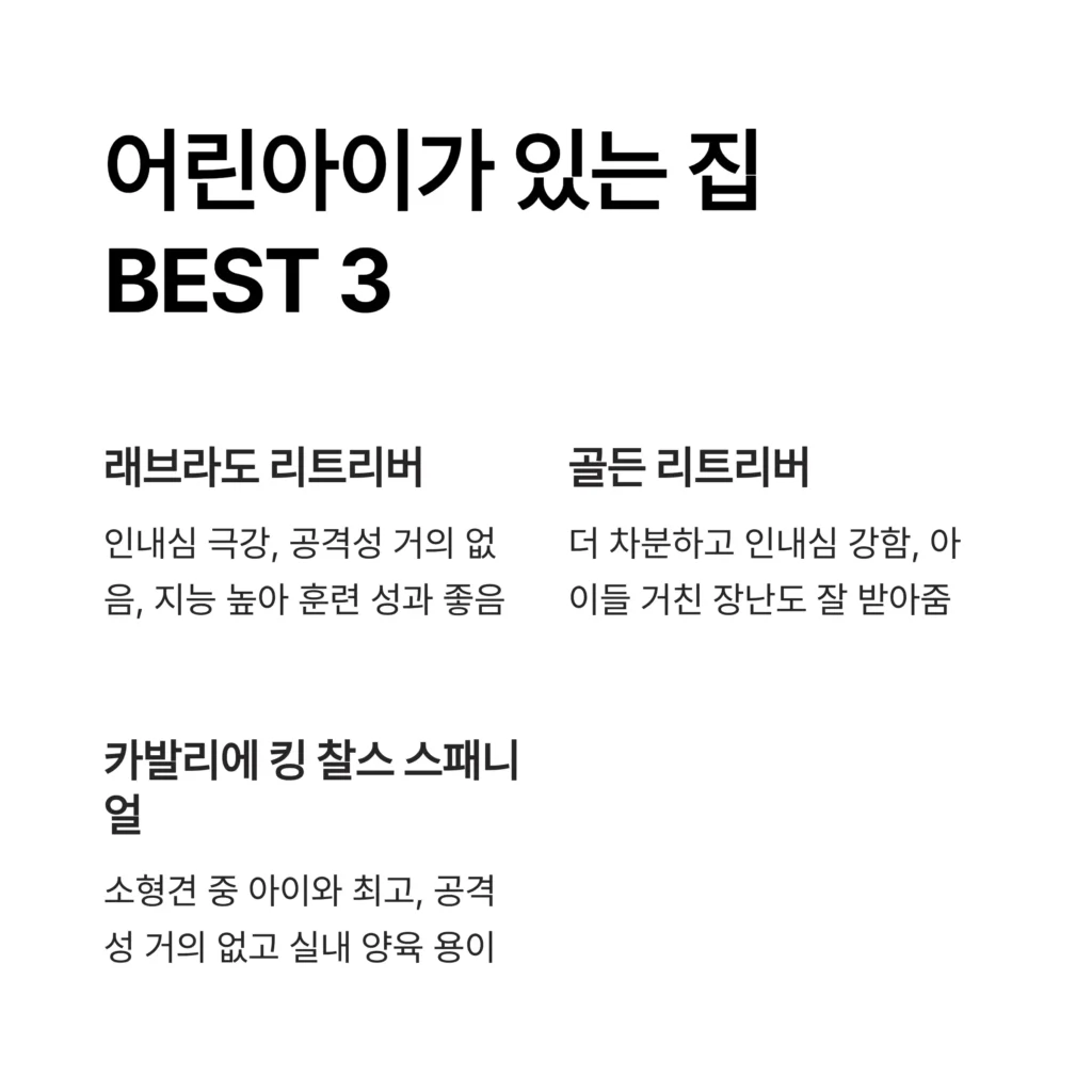 - 장점: 소형견 중 아이들과 가장 잘 지내는 견종입니다. 공격성이 거의 없고 사람을 무척 좋아하며, 크기가 작아 실내 양육이 용이합니다.