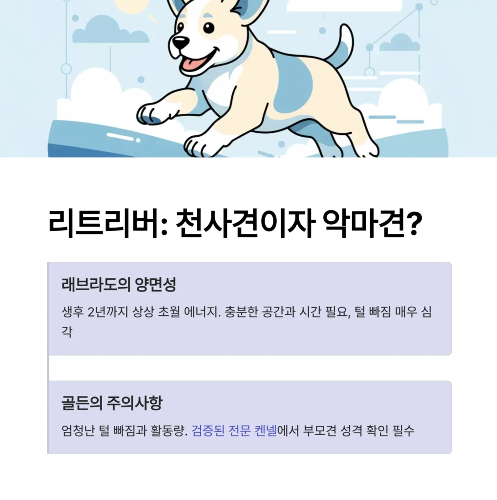 많은 분이 ‘순하다 = 얌전하다’고 오해합니다. 리트리버가 ‘천사견’인 동시에 ‘악마견’인 이유입니다. 성격은 순하지만, 넘치는 에너지를 보호자가 풀어주지 못하면 그 에너지는 집안의 벽지, 가구, 그리고 보호자를 향하게 됩니다. 당신이 감당할 수 있는 ‘에너지 레벨’이 견종 선택의 첫 번째 기준이 되어야 합니다. - 순한 성격vs 낮은 짖음