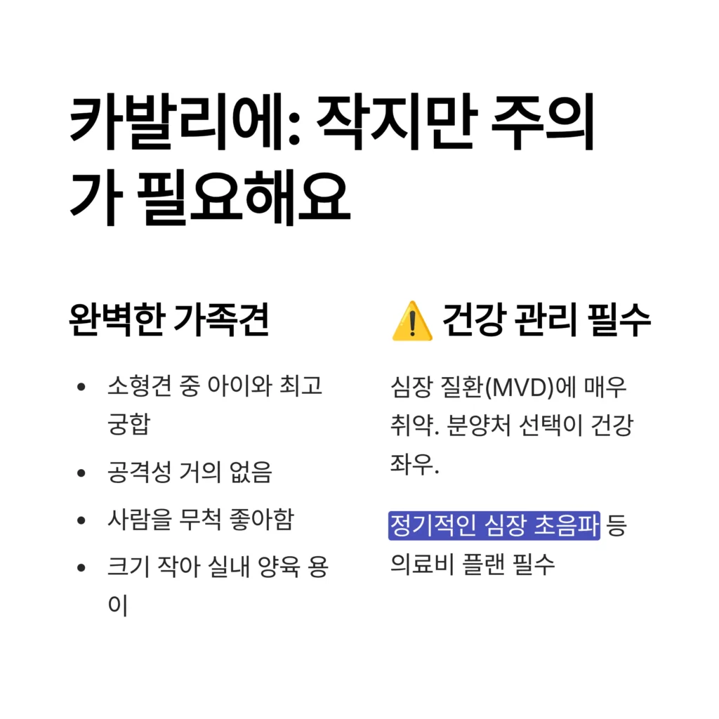 - 주의: 유전적으로 심장 질환(MVD)에 매우 취약한 견종입니다. 이는 ‘어디서 분양받는지’가 강아지의 건강과 직결된다는 의미입니다. 분양 비용 외에도, ‘정기적인 심장 초음파’ 등 지속적인 ‘의료비 플랜’을 반드시 세워두어야 합니다.