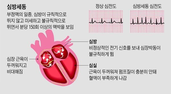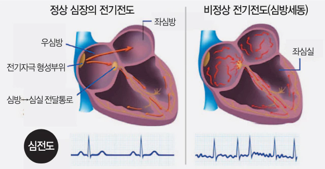 심방세동은 심장 이상 중 하나로, 심장의 신호가 정상적으로 전달되지 않아 발생합니다. 이러한 증상은 매우 위험하며, 심장 마비를 유발할 수 있습니다. 따라서, 적절한 치료가 필요합니다.